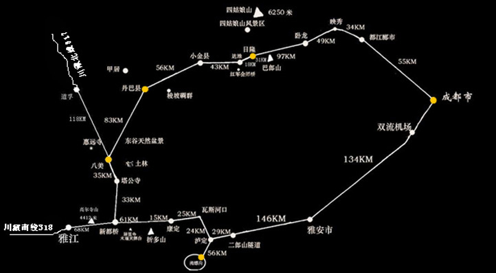 成都、映秀、日隆、四姑娘山、雙橋溝、長坪溝、達維、小金、丹巴、八美、新都橋、雅江、高爾寺