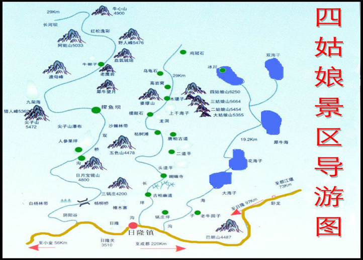 四姑娘山簡介雙橋溝:的得名是因為當地老百姓為了便于通行,在溝內搭建了兩座木橋,其中一座是由楊柳木搭建而成,俗稱楊柳橋;另一座由紅杉木搭建ÐÀ而成,俗稱便橋。這里是山峰的博覽會,是溝壑的陳列館。溝內的觀光車道直通溝尾,讓你能夠更加方便、快捷、舒適的游覽全程。雙橋溝全長34.8公里,已開發17個觀景點,54個景點。進入溝內,陰陽谷山勢陡峭,曲折幽深,別有洞天。景區分為三段:前段日月寶鏡山、五色山、尖子山、獵人峰、鷹嘴巖、人參果坪、中段攆魚壩、盆景灘、后段的紅杉林冰川等景致如錦簇畫廊,令人流連忘返。加之山水相依,草木相間,云遮霧繞,置身其中,宛若仙境。