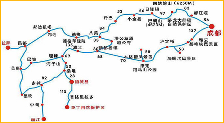 行程安排:拉薩--八一--波密--然烏--邦達--昌都--德格--爐霍--丹巴--成都