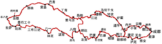 成都、都江堰、映秀、四姑娘山、日隆、雙橋溝、長坪溝、丹巴、塔公、新都橋、道孚、爐霍、甘孜、德格、甘孜寺、傾心湖、江達、昌都、邦達、八宿、然烏、然烏湖、米堆冰川、波密、八一、林芝縣、直白村、大峽谷、尼洋河、拉薩、布達拉宮、大昭寺、八角街