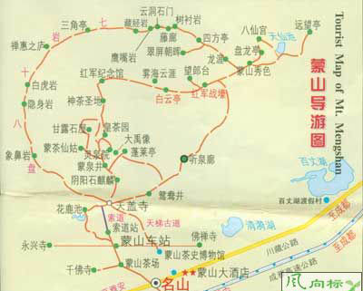 蒙頂山景區(qū)由蒙山和百丈湖兩個(gè)主景區(qū)組合而成,是四川首批省級(jí)風(fēng)景名勝區(qū)之一。座落在名山縣境內(nèi),距成都110公里,離雅安市15公里,318國道縱貫景區(qū),成都-雅安高速公路兩條引道與蒙山和百丈湖直接相連,交通十分方便。 蒙山,橫亙于名山縣城西北側(cè),山勢(shì)北高南低,呈東北一西南帶狀分布,延伸至雅安境內(nèi)。山體長約10公里,寬約4公里。蒙頂五峰環(huán)列,狀若蓮花,最高峰上清峰,海拔1456米。從蒙頂西眺可見峨眉、瓦屋、周公諸山。向東俯視,原野平疇,山巒起伏,溪澗縱橫,風(fēng)景如畫。現(xiàn)存建筑古剎永興寺、千佛寺、凈居庵等寺廟座落于茶園翠靄茂林間,紅墻梵宇,別增情趣。 蒙山因“雨霧蒙沫”而得名,這里因常年雨量達(dá)2000毫米以上,古稱“西蜀漏天”。西麓雅安有“雨城”之名,又有“雅安多雨,中心蒙山”之說。雨多而形成云多、霧多的景象。春夏秋季,從山巔俯瞰,云霧飄浮于山嶺溝壑之間,小山浮露,恰似仙山瓊閣。冬天從山下仰觀,冰絲雪掛,山崗云繞,亦真亦幻。日出時(shí)金光漫射,紅云飄浮。傍晚遠(yuǎn)望名山、雅安兩城萬家燈火,如繁星落地,景象萬千。 蒙山是中國種茶業(yè)和茶文化的發(fā)祥地之一,早在兩千多年前的西漢時(shí)期,蒙山茶祖師吳理真好開始在蒙頂馴化栽種野生茶樹,開始了人工種茶的歷史。唐宋時(shí)是蒙山茶的極盛時(shí)期。從唐玄宗天寶元年(724年)被列為貢品,作為天子祭祀天地祖宗的專用品,在民間,蒙頂茶歷來被看作祛疾去病的神來之物。因此,歷史悠久的蒙頂茶被稱為“仙茶”,蒙山被譽(yù)為“仙茶故鄉(xiāng)”。