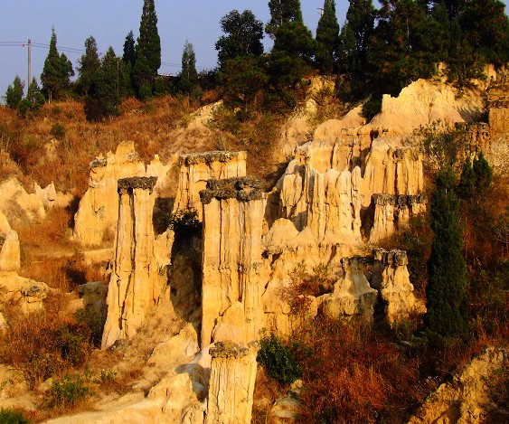 黃聯土林是在約一億年前的冰河時期,經冰水沉積流動和受新地殼運動影響,龜裂的沙粒礫層被地表水長年累月的滲透、沖刷、加深、擴大、立柱而形成的“自然雕塑博物館”。土林狀如云南石林,質地卻是黃色砂礫巖土,大多頂部已膠質鈣結,不易被風化沖刷,故能長久挺立不垮塌。黃聯土林全景6000多畝,其中自然景觀800多畝,配套石榴園200多畝,景區周邊造林綠化形成森林面積5000多畝。